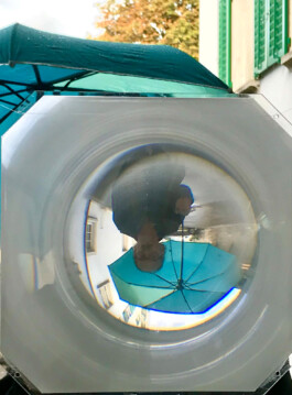 Installation mit Wasserwanne, Spiegel und Fresnel-Linse.